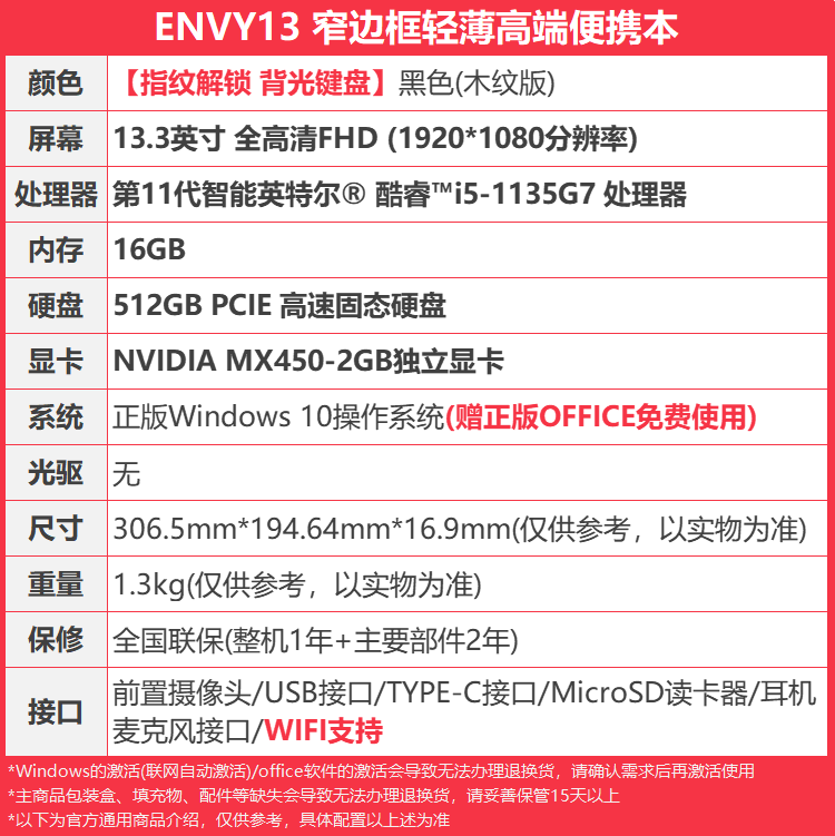 惠普(HP)|笔记本电脑,-【爆款】惠普HP【ENVY】笔记本电脑13.3 FHD 1W 100%/i5-1165G7/16G/512G PCIE/MX450-2G独显/黑色(木纹版)/指纹识别 背光