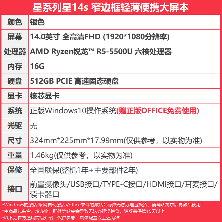 惠普(HP)|笔记本电脑,-惠普HP【青春版14s】笔记本电脑14 FHD/R5-5500U/16G/512G PCIE/银色