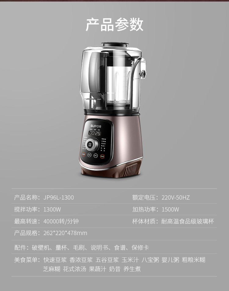 苏泊尔(SUPOR) JP96L-1300静音破壁机1500W静音榨汁机料理机多功能搅拌机 >