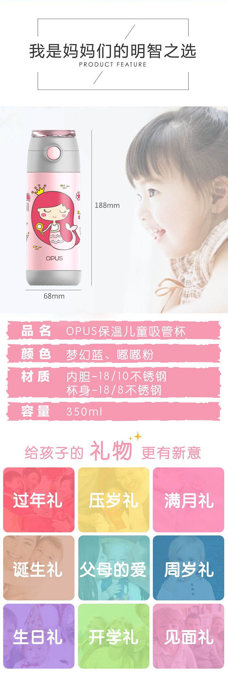 OPUS|保温杯,-OPUS 儿童保温杯不锈钢便携带卡通吸管杯350ml